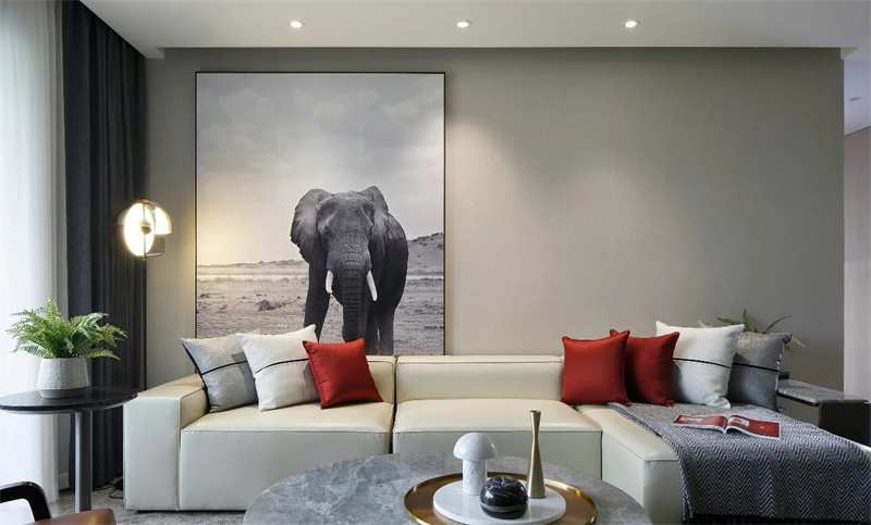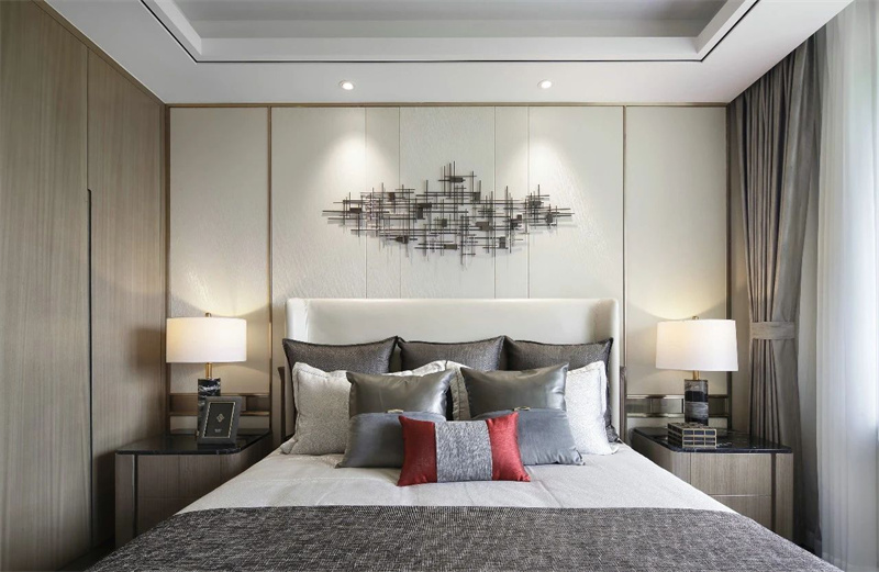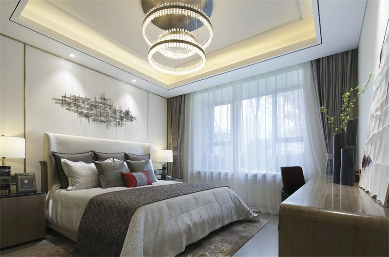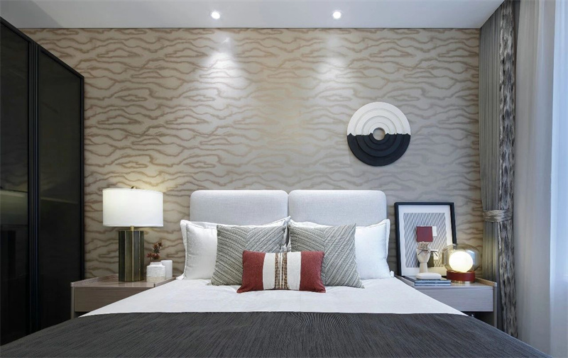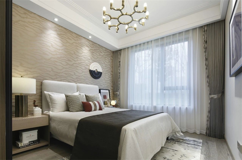 傳統(tǒng)的中式元素與現(xiàn)代的簡約設計完美結合,呈現(xiàn)出典雅與舒適的空間氛圍。床頭背景設計了一幅大型藝術背景裝飾,為整個房間增添了一份藝術氣息。大窗戶讓自然光線充盈房間,這樣的主臥空間,不僅是休憩的港灣,更是文化與現(xiàn)代生活的完美融合。
