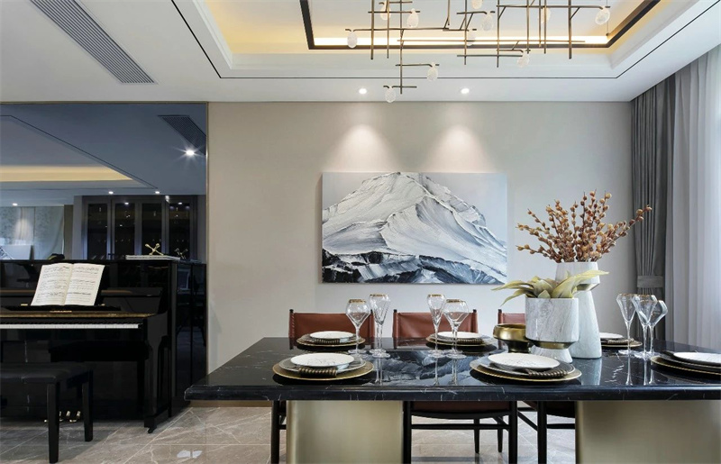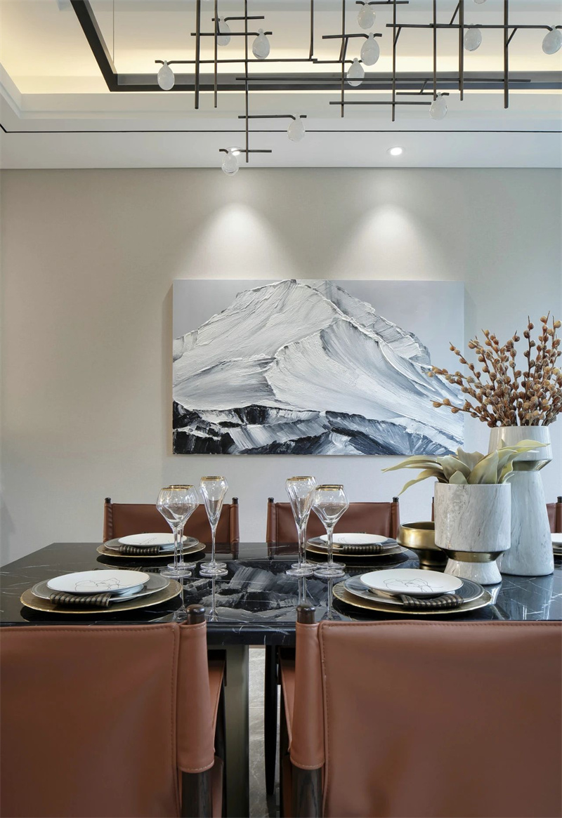 餐廳的餐桌椅采用深色調,融合傳統(tǒng)工藝與現(xiàn)代簡約線條,獨具匠心。餐桌中央擺放著玻璃花瓶,里面插著新鮮的花卉,為餐廳增添了一份生機與色彩。頂部懸掛著精美吊燈,柔和的燈光灑在餐桌上,營造出溫馨的用餐氛圍。