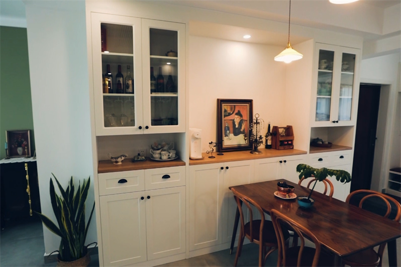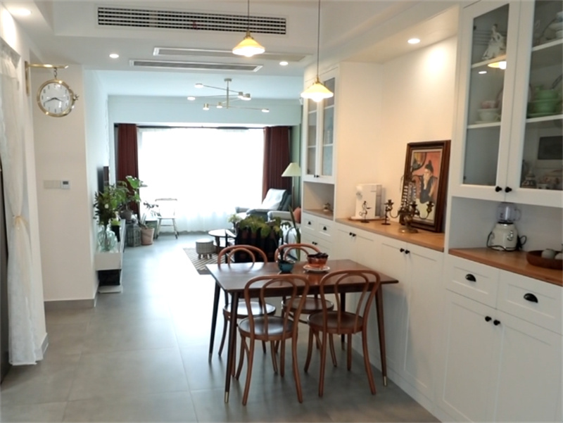 本案客餐廳以灰、白、果綠為主,自然、安靜、舒適,整體硬裝少而精,軟裝+綠植豐富整個空間,讓房子生動起來,像植物園一樣有生機,更讓整個空間鮮活起來。每次回到家都是一次心靈的放松,沙發(fā)背景采用一組簡約美觀的裝飾畫,配上清新的綠植,點亮了空間的文藝與清新。