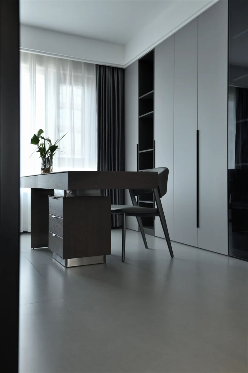 書房空間通透寧靜,以灰白為主調(diào)。黑色金屬框玻璃門隔斷,既保證私密性,又不影響采光與視線通透。室內(nèi)地面鋪設(shè)灰色啞光地磚,墻面簡潔無飾,突出空間的純粹感。整體布局簡潔有序,摒棄多余裝飾,打造一個安靜、高效、富有質(zhì)感的獨立思考與工作空間,讓思緒在靜謐中自由流淌。