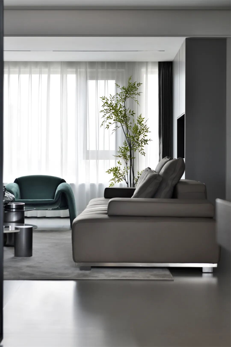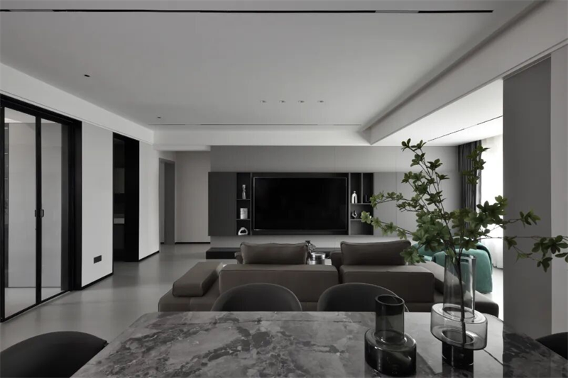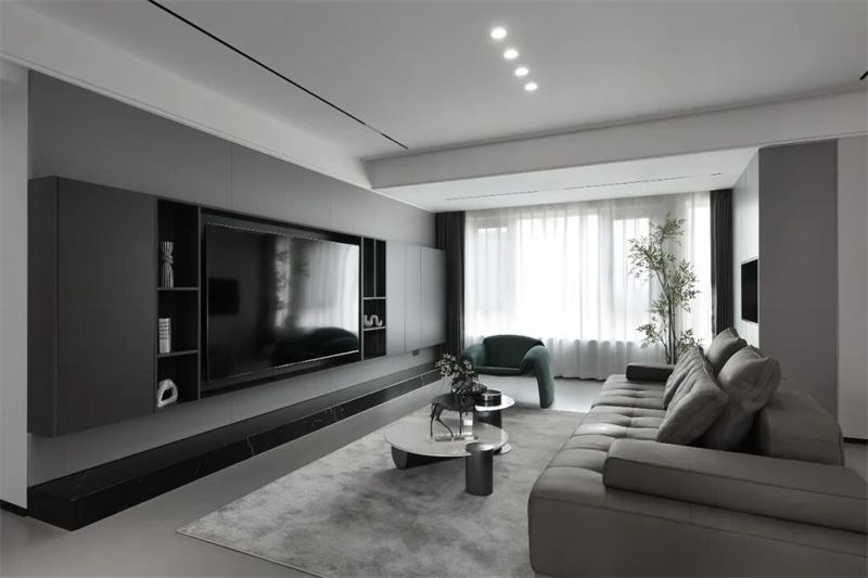 本案以現(xiàn)代極簡為設(shè)計語言,摒棄冗余裝飾,用純粹的線條、克制的色彩與精煉的材質(zhì),構(gòu)建出一個靜謐而有力量的空間。黑白灰為主調(diào),輔以一抹綠意點綴,既體現(xiàn)秩序之美,又不失溫度與呼吸感。從空間布局到細節(jié)處理,每一處都遵循“少即是多”的原則,讓居住回歸本質(zhì)——簡潔、從容、自由。