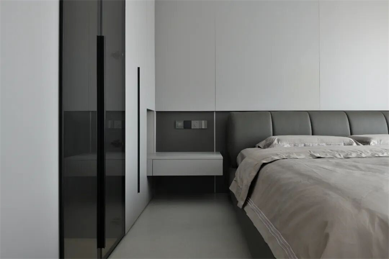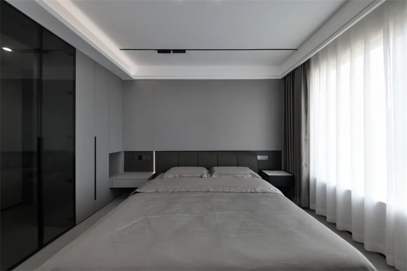主臥床頭背景墻采用整面定制護墻板設(shè)計,軟包床頭靠背舒適貼合,搭配淺灰色床品,低調(diào)中透出高級質(zhì)感。兩側(cè)懸空床頭柜設(shè)計輕盈實用,內(nèi)置隱藏式燈帶,提供柔和夜光照明,兼顧美觀與功能性。大窗戶配白色紗簾與深色遮光簾,自然光可自由調(diào)節(jié),保證私密性的同時引入柔和光線。頂部無主燈設(shè)計,結(jié)合線性燈帶與筒燈,營造層次分明的燈光氛圍。
