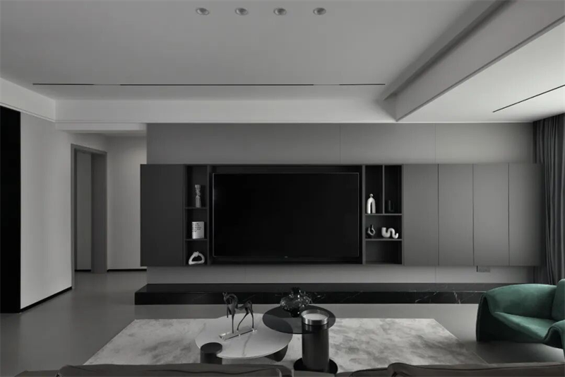 客廳以現(xiàn)代極簡風(fēng)格為基調(diào),整體采用灰黑配色,營造出沉穩(wěn)內(nèi)斂的空間氣質(zhì)。電視背景墻采用整面定制柜體設(shè)計,深灰色啞光面板與開放式格架結(jié)合,嵌入式電視隱藏其中,視覺整潔統(tǒng)一。底部黑色大理石基座提升層次感,兼具裝飾與收納功能。