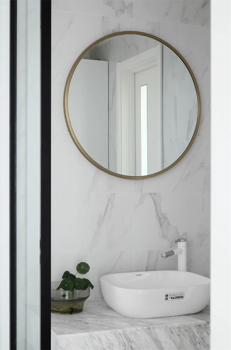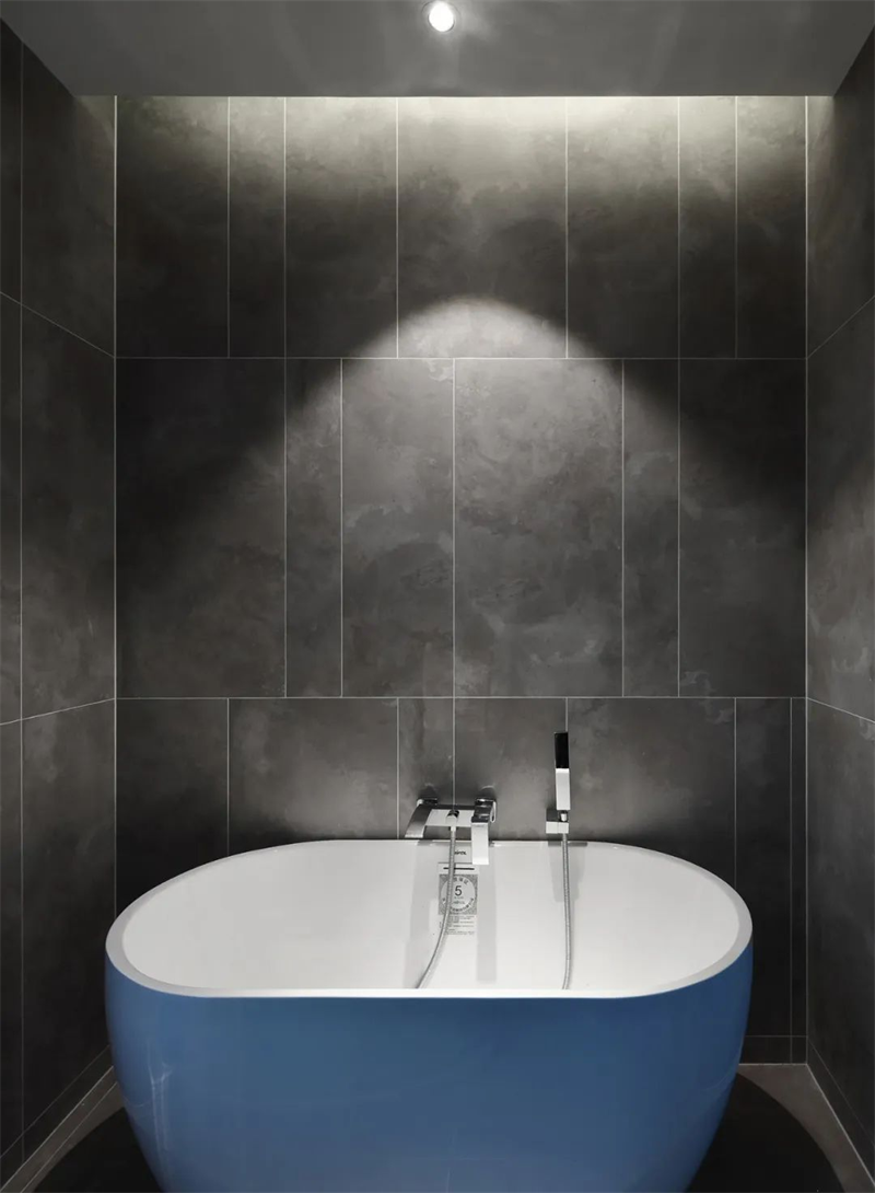 衛(wèi)生間的洗手臺設(shè)計簡約,搭配定制儲物柜,采用中性色調(diào),為業(yè)主提供收納空間的同時維持整潔。浴缸采用獨立式設(shè)計,周圍點綴著灰色瓷磚,強(qiáng)調(diào)了空間的純粹與線條感,完美融合了日常實用性和美學(xué)價值,還為衛(wèi)生間增添了一份藝術(shù)的韻味。