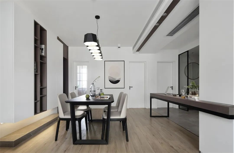 餐廳延續(xù)了極簡風(fēng)格,以簡約的餐桌和現(xiàn)代餐椅為特色。白色墻壁和深色的定制柜創(chuàng)造了一個純凈的用餐環(huán)境。餐廳頂面的一排吊燈提供適當(dāng)?shù)牧炼?,并增添溫馨氛圍,不僅適合家庭用餐與客人的聚會,更使用餐成為一種愉悅的體驗。