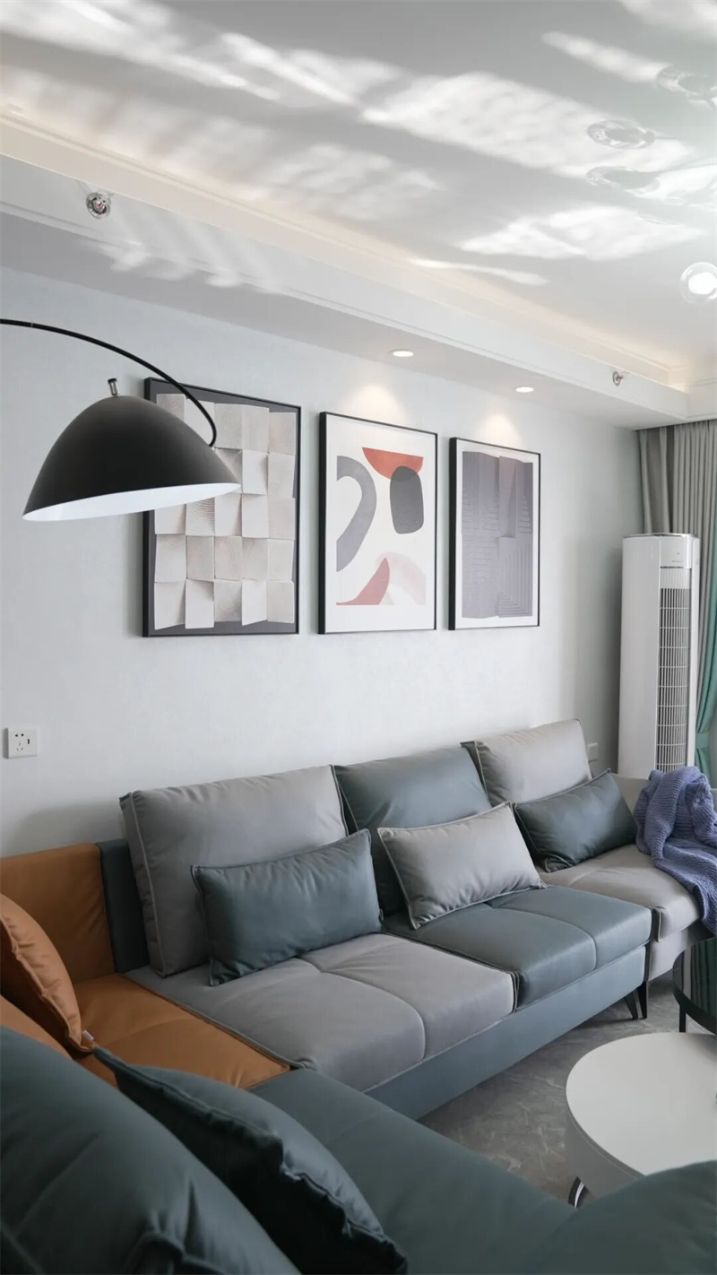 墻面三幅抽象藝術(shù)掛畫錯落有致,為空間注入藝術(shù)氣息,與弧形落地燈共同勾勒出柔和的光影節(jié)奏。大面積淺色墻漆與通透采光相輔相成,讓整個空間明亮開闊。一旁綠植點綴的陽臺區(qū)域,將自然生機引入室內(nèi),賦予生活更多呼吸感。