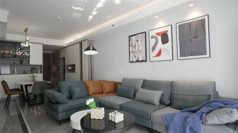 客廳以現(xiàn)代簡約風(fēng)格為基調(diào),巧妙融合功能與美學(xué),營造出舒適而富有格調(diào)的生活空間。灰藍色與暖棕的拼色沙發(fā),既提升了視覺層次感,又帶來溫暖的居家氛圍;搭配圓形金屬茶幾與黑白撞色設(shè)計,簡潔而不失設(shè)計感。