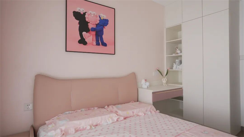 兒童房以溫柔的粉色為主調(diào),營造出夢幻而溫馨的成長空間。柔和的粉墻搭配同色系軟包床頭與床品,點綴星星、云朵圖案,仿佛將童話輕輕鋪展在眼前。窗邊垂落的粉灰拼色窗簾,透光而不失私密,讓陽光灑入時也帶著一絲俏皮。墻上懸掛的潮流藝術(shù)掛畫,融合童趣與時尚感,為房間注入個性與活力。